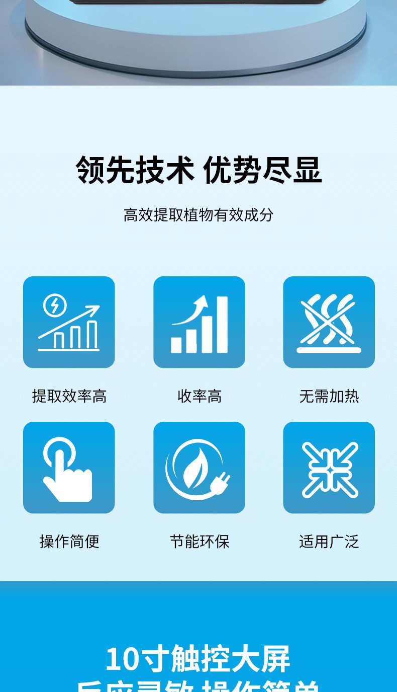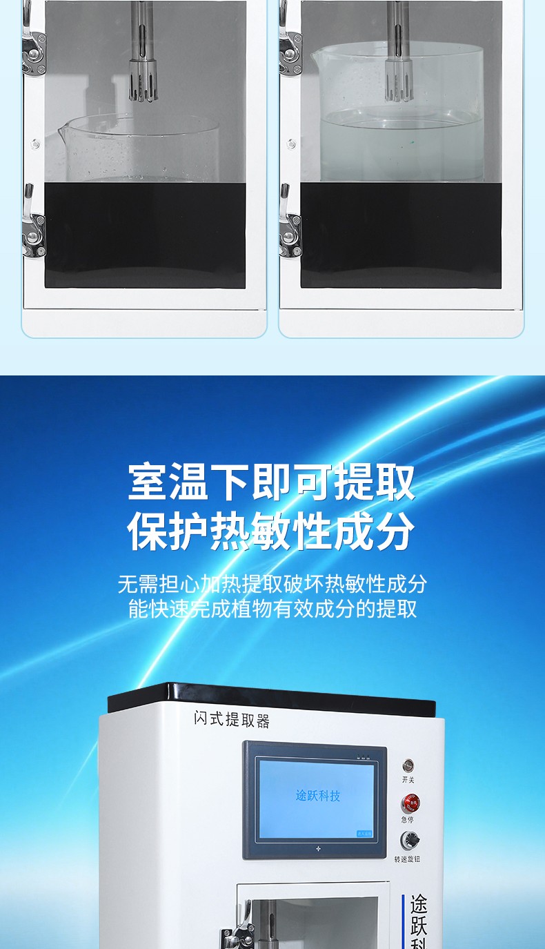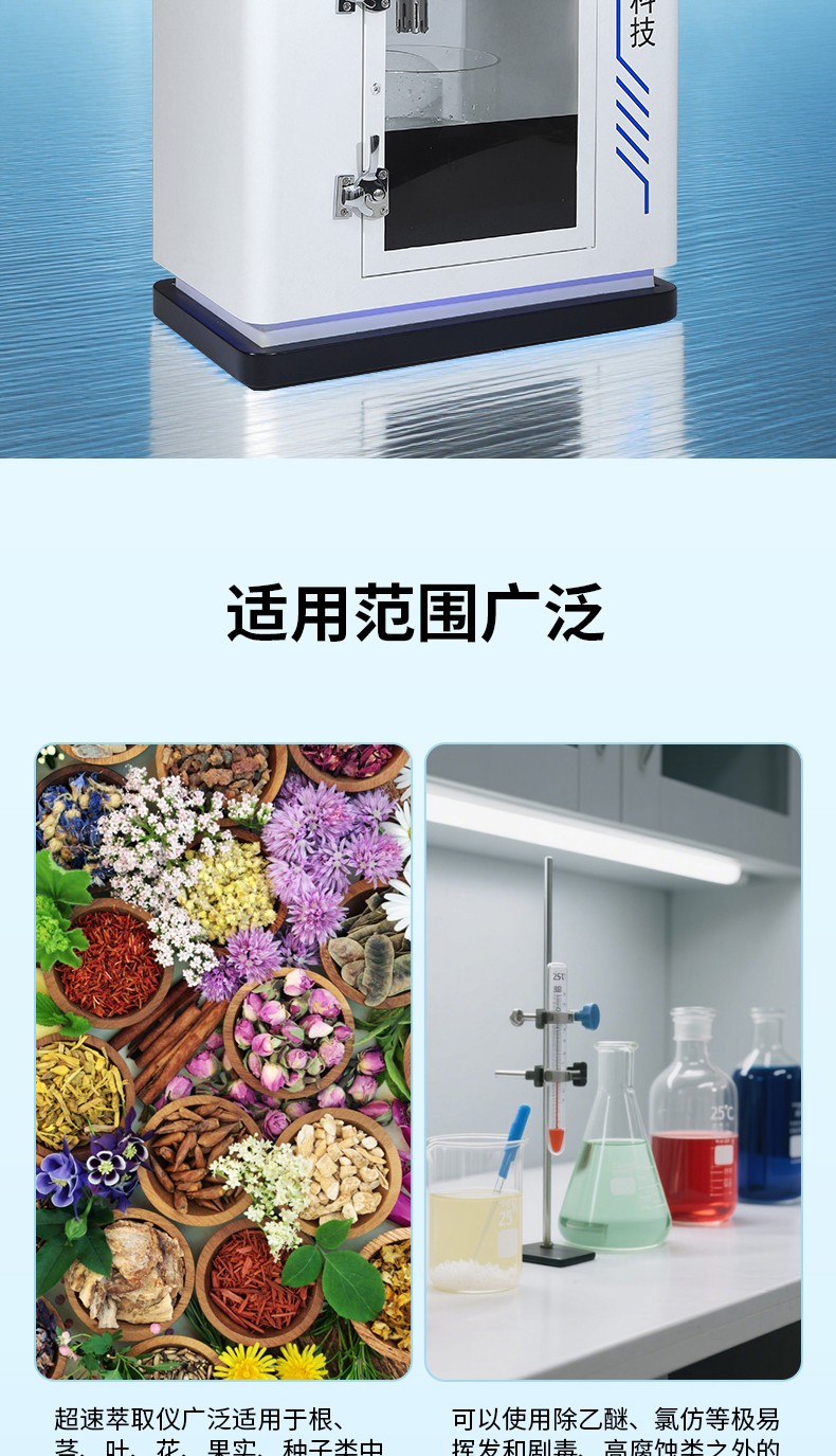 1) 數分鐘內快速提取:數分鐘內可將有效成分快速轉移到溶劑內,工作效率是傳統方法的百倍以上。
